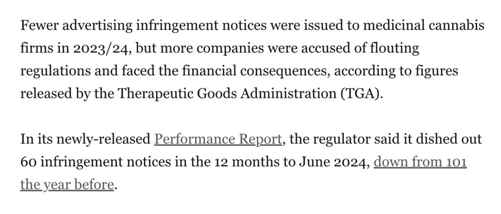 Advertising breaches fall but more companies fined for unlawful content, TGA report reveals Read full story – paywall Advertising breaches fall but more companies fined for unlawful content, TGA report reveals The Report Therapeutic Goods Administration Performance Report – 2023-24 This report provides information about our regulatory performance for the 2023-24 financial year. Published […]