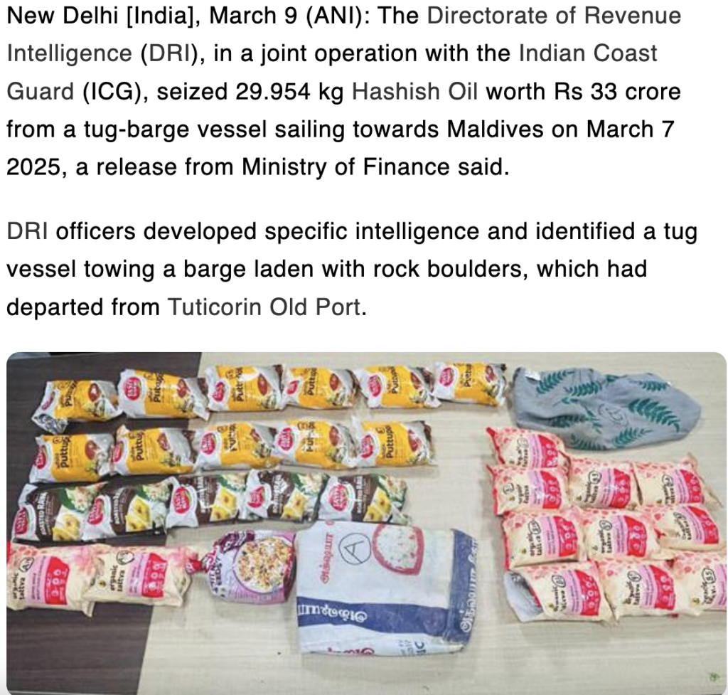 DRI, Indian Coast Guard seize 30 kg Hashish oil in joint operation, 3 held   Read more at: https://www.aninews.in/news/national/general-news/dri-indian-coast-guard-seize-30-kg-hashish-oil-in-joint-operation-3-held20250309180305/