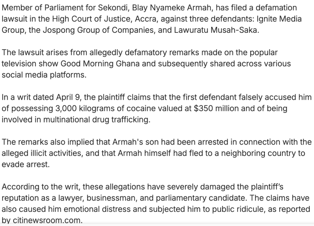 Read more at https://www.ghanaweb.com/GhanaHomePage/NewsArchive/Sekondi-MP-sues-NPP-member-Jospong-and-Metro-TV-for-350M-cocaine-accusation-1979433