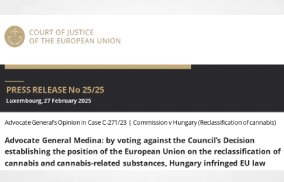 Cannabis: EU Advocate General’s Opinion in Case C-271/23 – EU Commission v Hungary   Luxembourg, 27 February 2025 EU Advocate General’s Opinion in Case C-271/23 – Commission v Hungary (Reclassification of cannabis) Advocate General Medina: By voting against the Council’s Decision establishing the position of the European Union on the reclassification of cannabis and cannabis-related […]