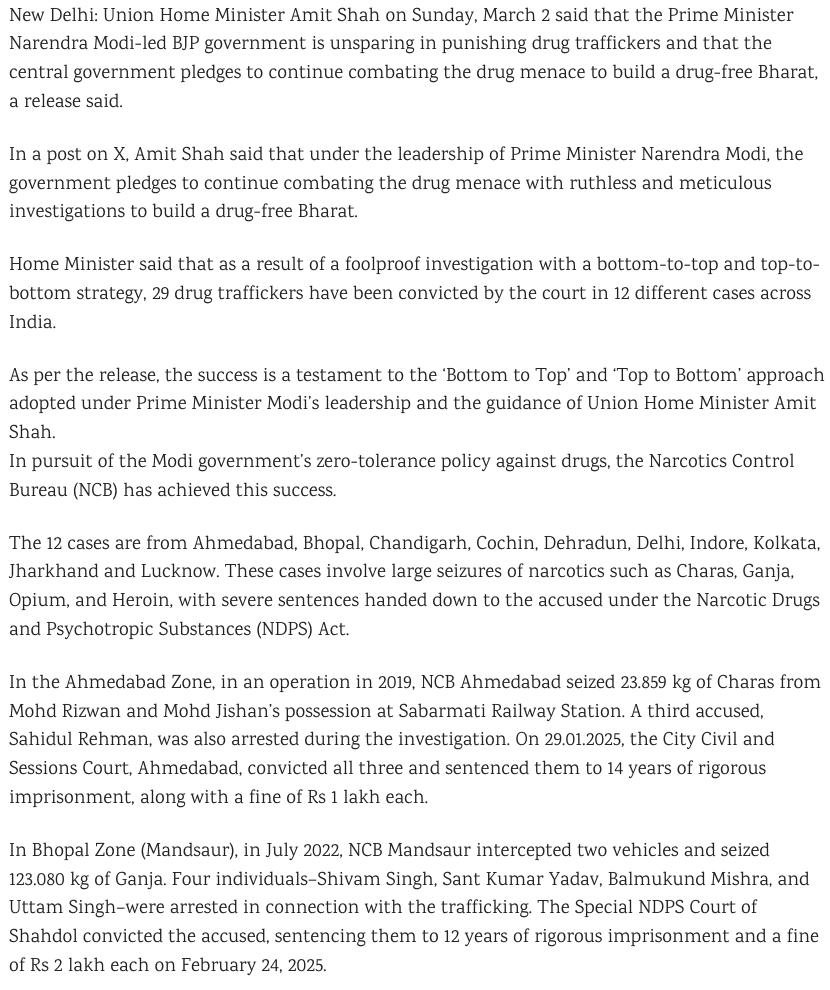 Media Article: Under PM Modi’s leadership, Govt pledges to combat drug menace to build drug-free Bharat: Amit Shah……