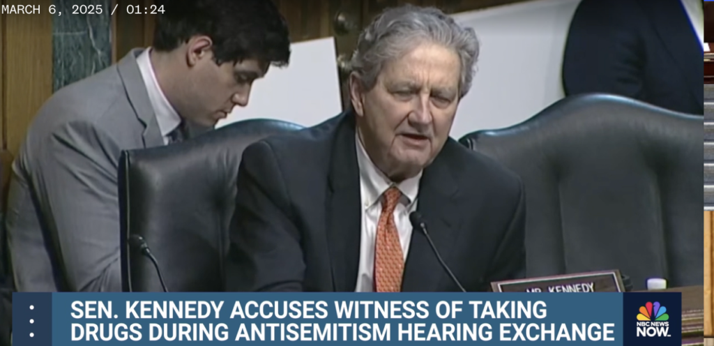 Sen. John Kennedy, R-La., accused a witness of being on ketamine during a Senate Judiciary hearing on combatting antisemitism. Kennedy told Kevin Rachlin, a fellow at the Alliance for Peacebuilding, that he was “dipping into [his] ketamine stash” during questioning. https://www.nbcnews.com/video/sen-kennedy-accuses-hearing-witness-of-ketamine-use-233563717506?utm_source=beehiivemail&utm_medium=email&utm_campaign=sorry-l-a-times-but-cacao-isn-t-ayahuasca
